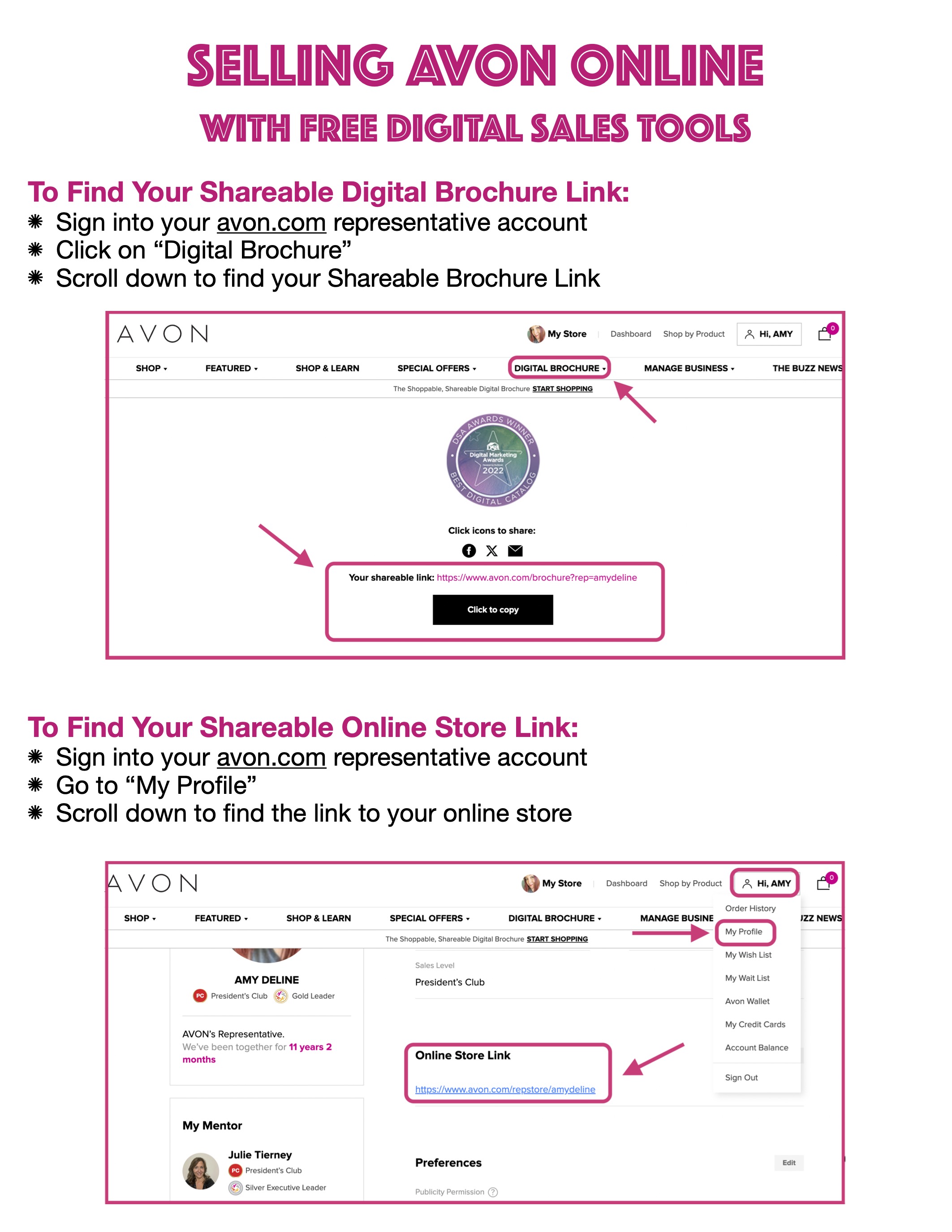 Share these links through email, text, and messenger. Add the links to your social media profile, business cards, and the back of your printed brochures. Include the links in your social media posts about Avon.