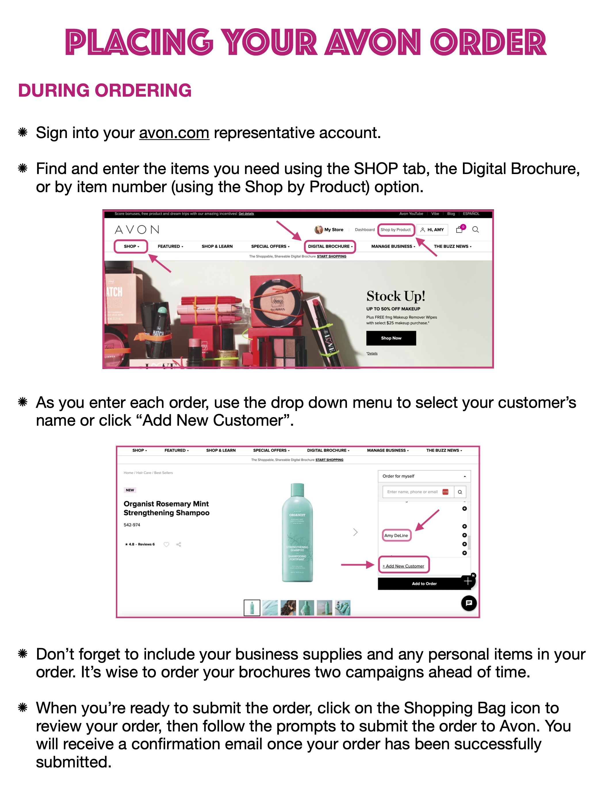 You can order brochures, samples, bags, and products (for yourself and/or to use as demos) anytime through your avon.com representative account, under the SHOP tab.